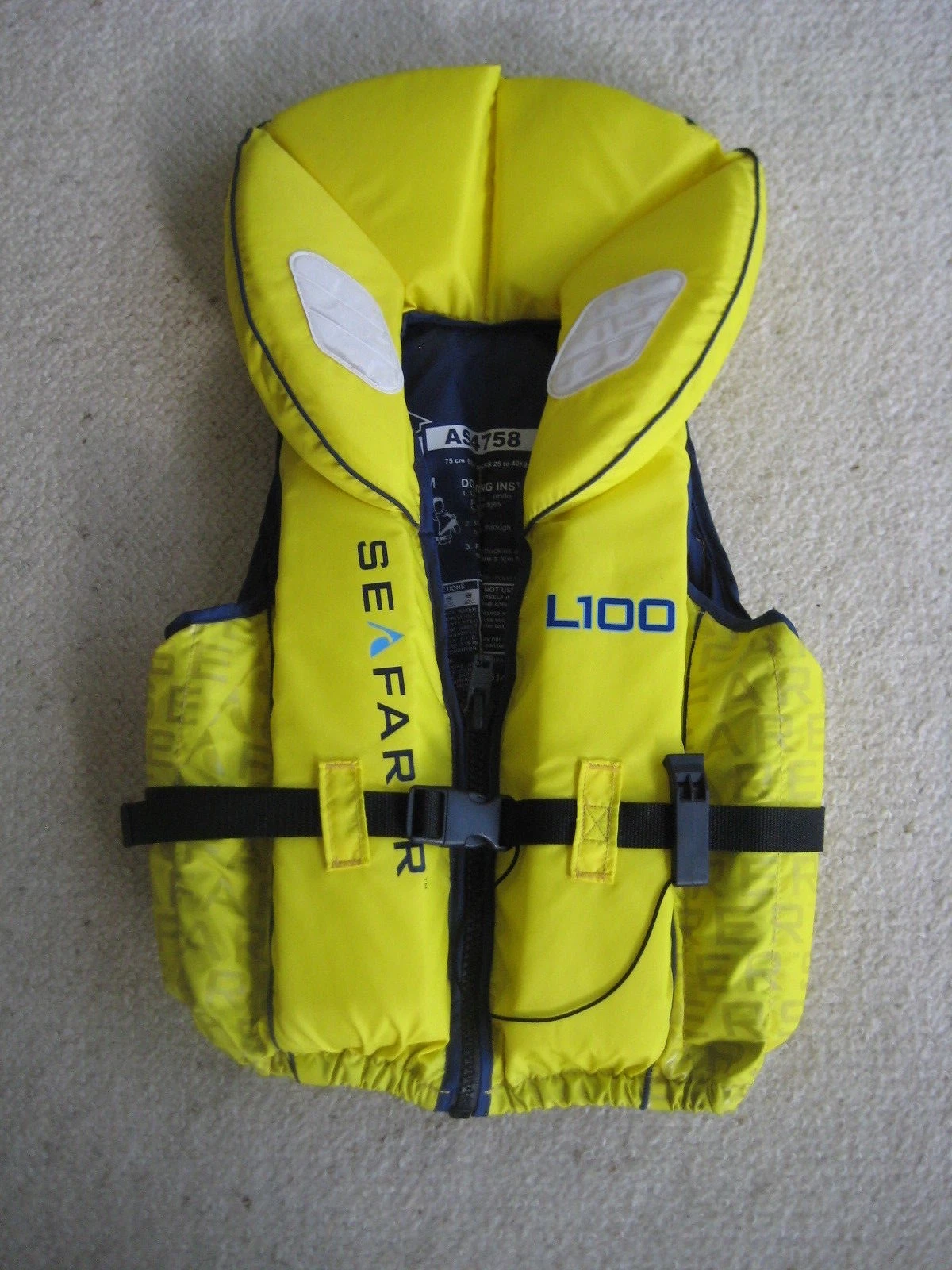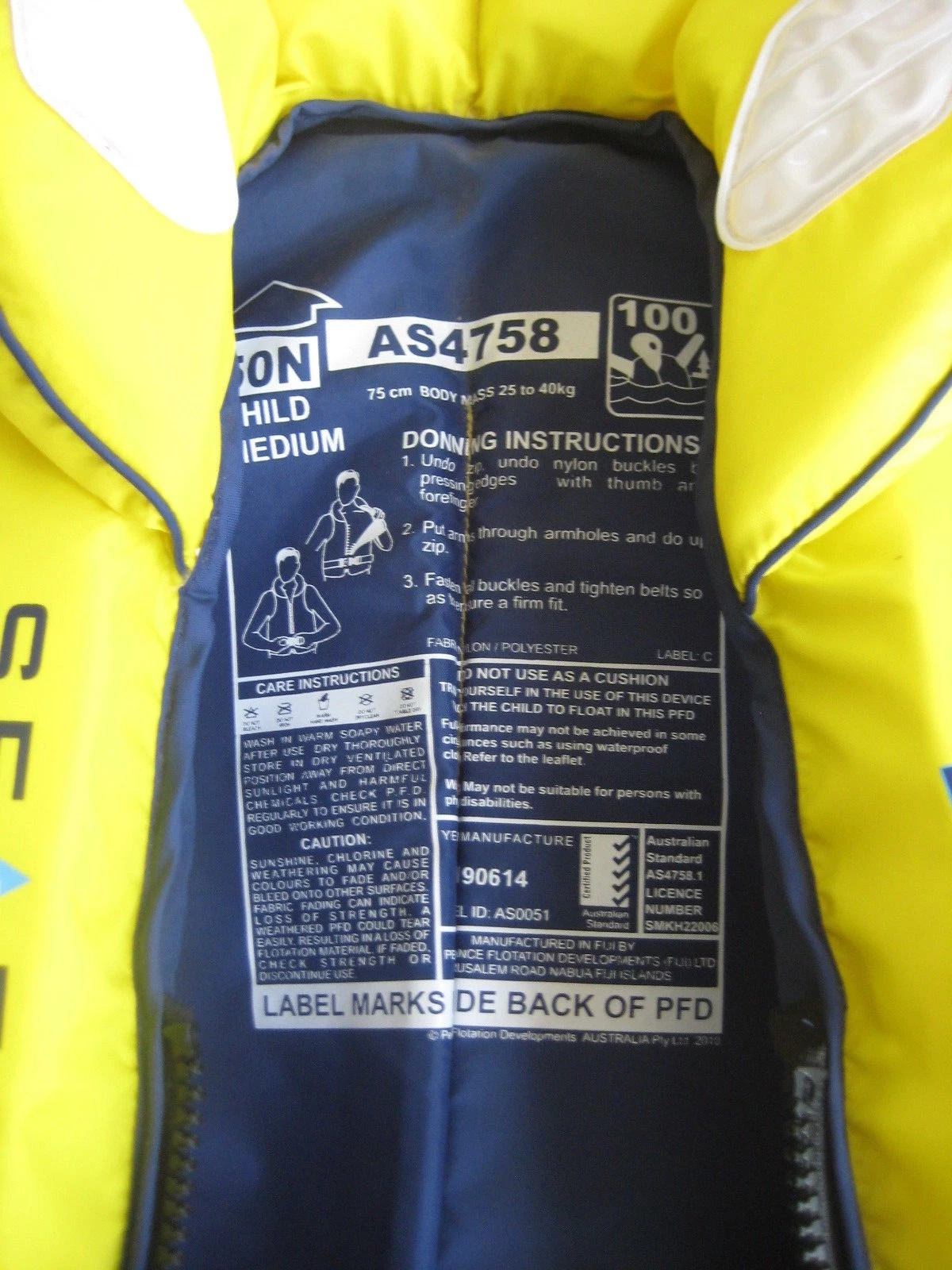 Childs Life Jacket by Seafarer Marine . The jacket is 25 to 40 Kg & rated L100 or old rating PFD 1 . Comes with lanyard strap with safety whistle . Bright safety yellow