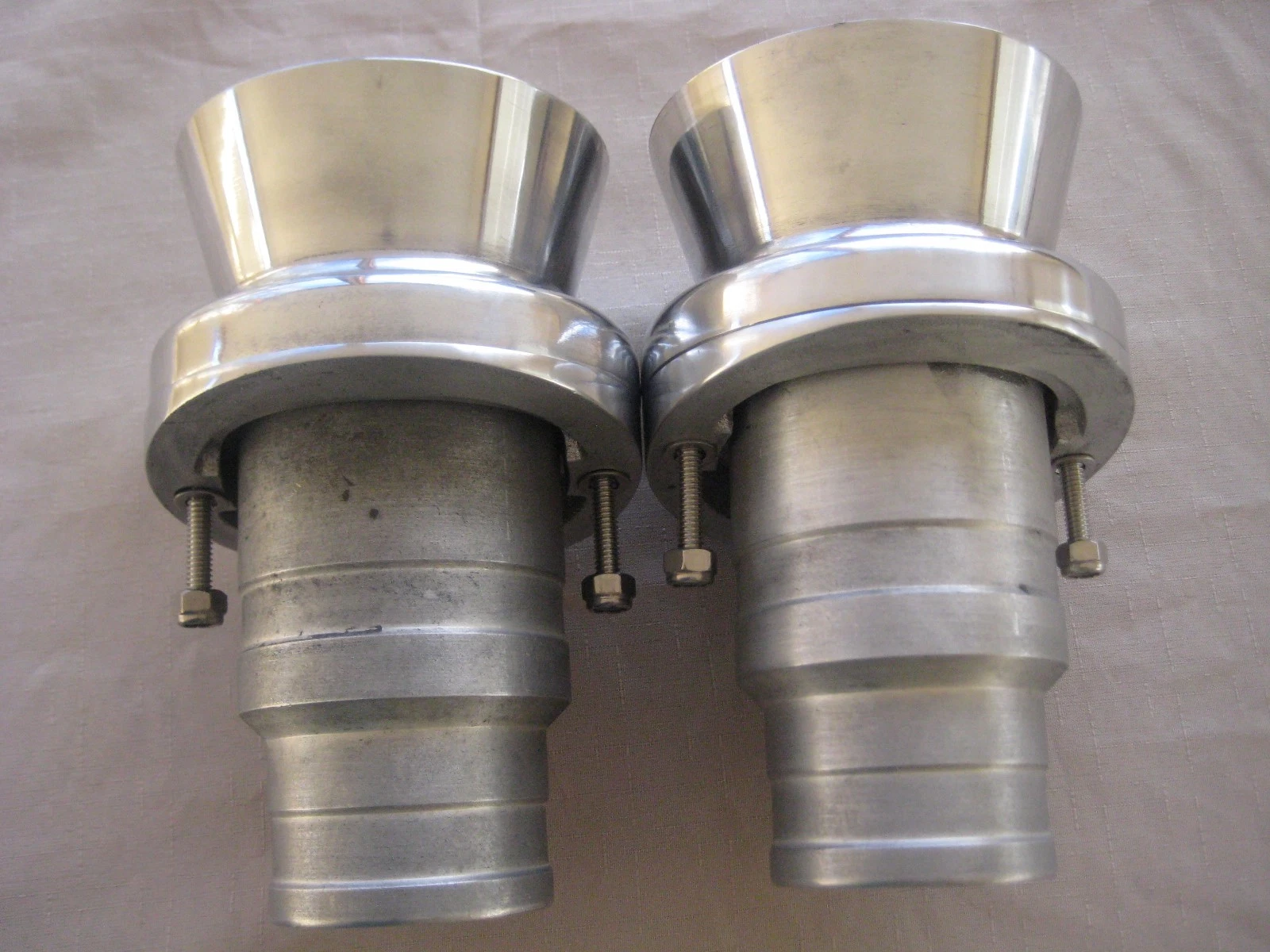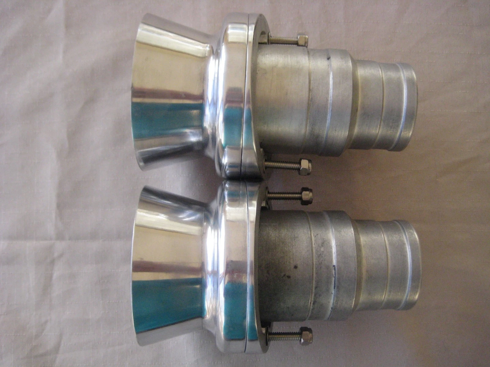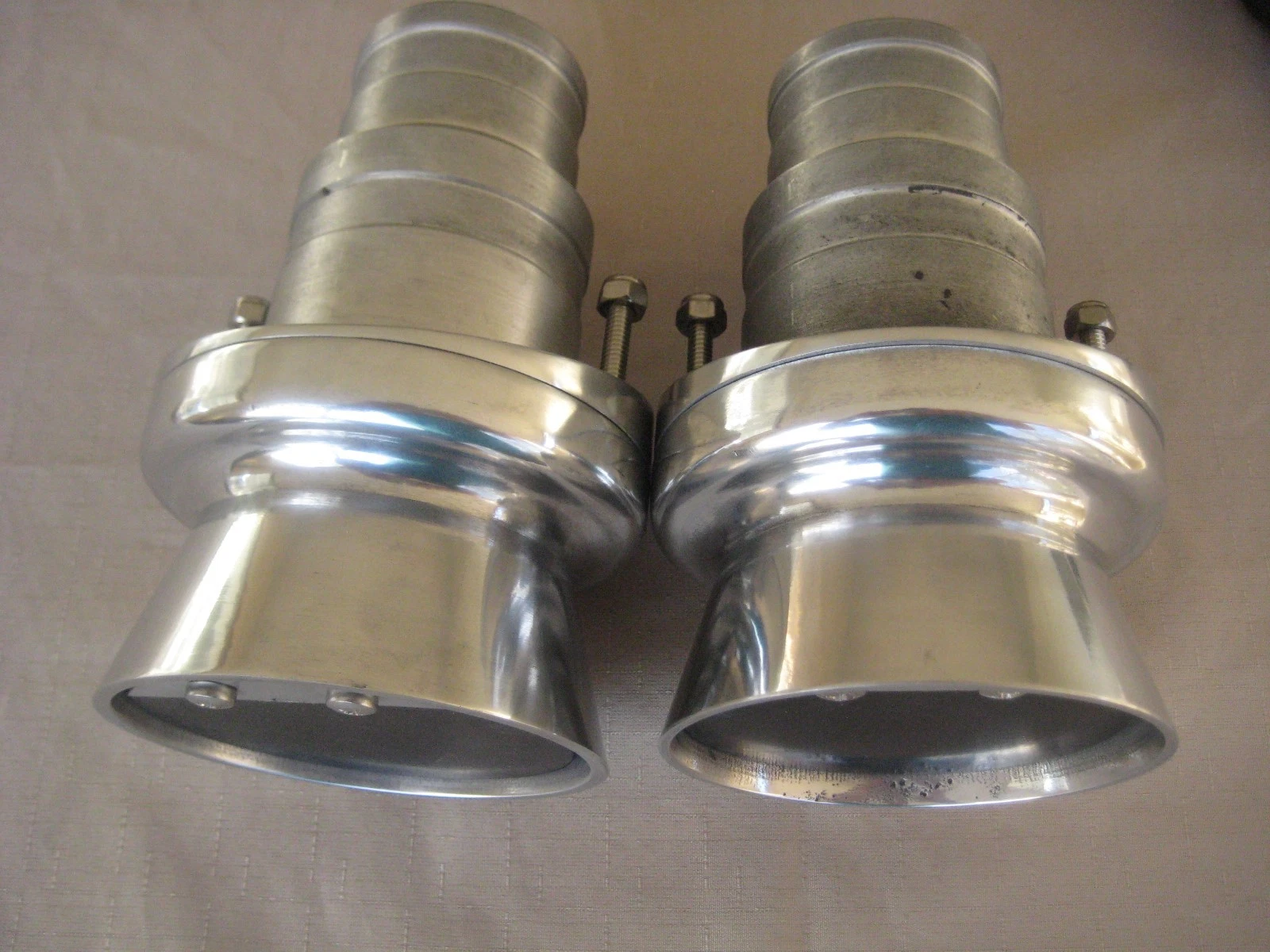 FLARED MEGAPHONE ALI ANGLED EXHAUST OUTLETS . UNIVERSAL SUIT 2 1/2 INCH & 3 INCH EXHAUST PIPES . THESE POLISHED ALI OUTLETS ARE MADE TO SUIT ANGLE DEGREE TRANSOMS ( ANGLED ) . YOUR PRICE FOR A PAIR $385.00 + $17.00 POSTAGE . ALSO AVAILABLE OUTLETS TO SUIT 90 DEGREE TRANSOMS THIS EXHAUST OUTLET CAN BE PURCHASE AS A SINGLE TO SUIT 6 CYLINDER APPLICATIONS. SEE OUR OTHER ITEMS