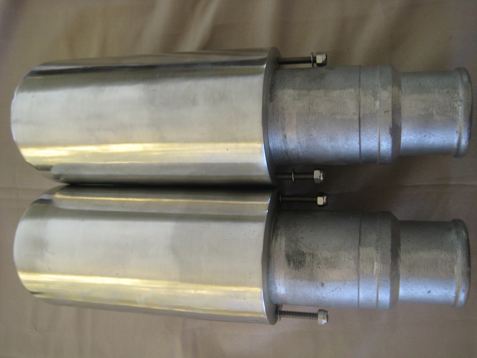 A PAIR OF EXTENDED EXHAUST OUTLETS TO SUIT 90 DEGREE TRANSOMS OR ANGLED TRANSOMS . THE POLISHED ALUMINIUM OUTLETS SUIT 2.5 & 3 INCH SYSTEMS . THEY ARE CAST TO SUIT BOTH SIZES . IF YOU NEED 3 INCH THE 2.5 INCH IS REMOVED TO MAKE IT 3 INCH . THE FLAPS ARE SECURED WITH STAINLESS STEEL METAL THREAD SCREWS TO MAKE EASY REMOVAL & REPLACEMENT OF THE RUBBER FLAPS IF NEEDED .