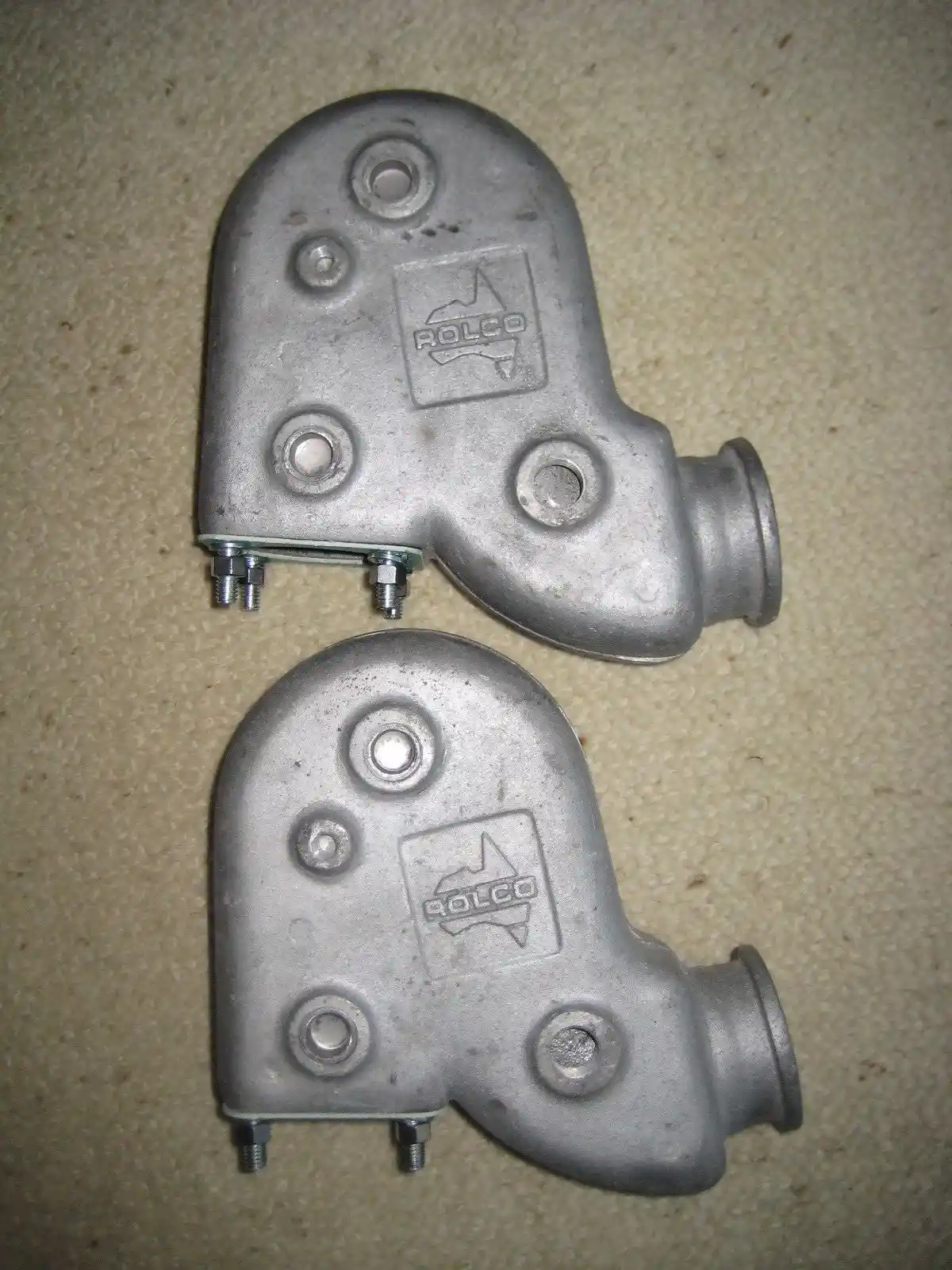 WATER COOLED 6 INCH HI RISE ELBOWS . SUITABLE FOR ALL INBOARD MOTOR APPLICATIONS . SOLD AS A PAIR . THESE WATER COOLED HISERS WILL BOLT STAIGHT ON TO ROLCO MANIFOLDS WITH 4 BOLT SQUARE FLANGE . THE CAN BE USED ON TAWCO & MCE WATER COOLED MANIFOLDS WITH SLIGHT MODIFICATION . SEE PHOTOS 3 & 4 .