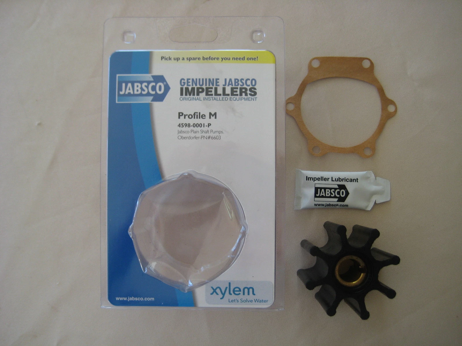 THIS IS A GENUINE JABSCO WATER PUMP IMPELLER . NOT A CHINESE LOOK ALIKE THAT WILL LET YOU DOWN . Kit includes genuine Jabsco impeller , Gasket , Lube to run the impeller in . Very important .